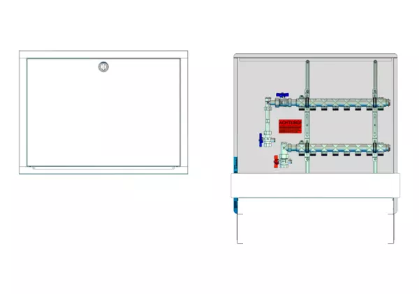 vertikale Anschlussgarnitur mit Wärmezählerverrohrung, Verteiler ohne Einbauten, Standard-Unterputz-Schrank mit Frontblende in RAL 9016