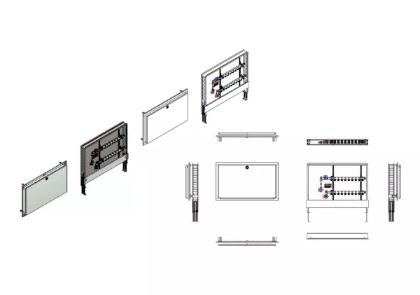Die Anschlussstation für Heizkörperanbindungen ist im Unterputzschrank montiert und umfasst einen Edelstahlverteiler ohne zusätzliche Einbauten im Heizkreis, sowie eine vertikale Anschlussgarnitur mit Wärmezählerverrohrung.