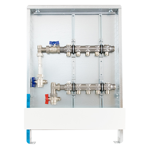 Die Anschlussstation ist für Heizkörperanschlüsse geeignet. Hydraulisch können die Heizkreise in der Station nicht abgeglichen werden. Im Standard-Unterputzschrank mit Frontblende in weiß RAL 9016 mit einer Einbautiefe von 110 bis 150 mm ist ein Edelstahlverteiler ohne zusätzliche Regulier- und Absperreinbauten schallentkoppelt montiert. Eine vertikale Anschlussgarnitur mit Wärmezählervorbereitung 3/4" Länge 110 mm und Fühleranschluss 5-5,2 M10x1 im Vor- und Rücklaufkugelhahn ist montiert.