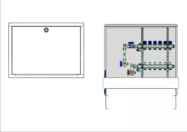 strawa FB-Anschlussstation H 53-WMZ-80 6 Hkr.,BxHxT: 750x725x92 mm, vert. AG m. WMZ, Verteiler mit Regulierventil + THV M30x1,5, Standard-UP-Schrank mit Frontblende in RAL 9016