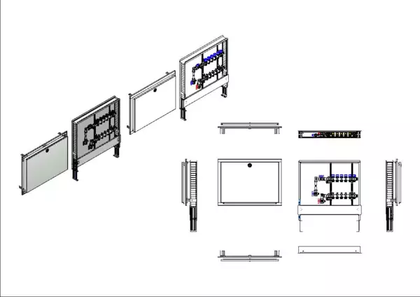 Die Anschlussstation für Flächenheizung und -kühlung ist im Unterputzschrank montiert und umfasst einen Edelstahlverteiler mit integrierten Regulierventilen und Ventileinsätzen (M30x1,5), sowie eine vertikale Anschlussgarnitur mit Wärmezählerverrohrung. Es gibt Platzhaltungen für eine Klemmleiste und Stellantriebe.