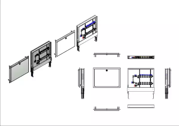 Die Anschlussstation für Flächenheizung und -kühlung ist im Unterputzschrank montiert und umfasst einen Edelstahlverteiler mit integrierten Regulierventilen und Ventileinsätzen (M30x1,5), sowie eine vertikale Anschlussgarnitur mit Wärmezählerverrohrung. Es gibt Platzhaltungen für eine Klemmleiste und Stellantriebe.