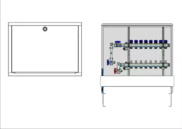 strawa FB-Anschlussstation H 53-WMZ-80 8 Hkr.,BxHxT: 750 x 725 x 92 mm, vert. AG m. WMZ, Verteiler mit Regulierventil + THV M30x1,5, Standard-UP-Schrank mit Frontblende in RAL 9016