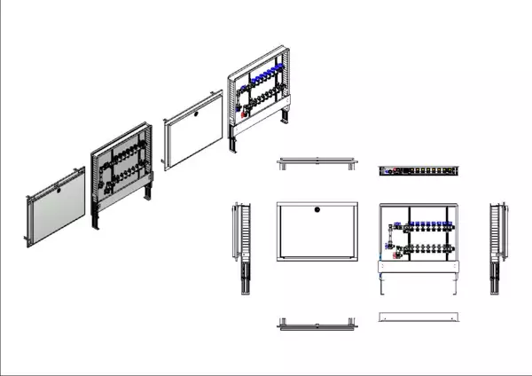 Die Anschlussstation für Flächenheizung und -kühlung ist im Unterputzschrank montiert und umfasst einen Edelstahlverteiler mit integrierten Regulierventilen und Ventileinsätzen (M30x1,5), sowie eine vertikale Anschlussgarnitur mit Wärmezählerverrohrung. Es gibt Platzhaltungen für eine Klemmleiste und Stellantriebe.