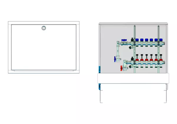 strawa FB-Anschlussstation H 63-WMZ-80 6 Hkr.,BxHxT: 750x725x92 mm, vert. AG. m. WMZ, Verteiler mit DFA 0-3 l/min + THV M30x1,5, Standard-UP-Schrank mit Frontblende in RAL 9016