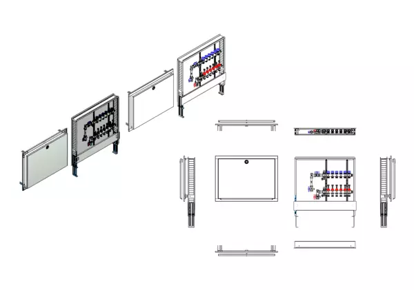 Die Anschlussstation für Flächenheizung und -kühlung ist im Unterputzschrank montiert und umfasst einen Edelstahlverteiler mit regulierbaren Durchflussanzeigern und Ventileinsätzen (M30x1,5), sowie eine vertikale Anschlussgarnitur mit Wärmezählerverrohrung. Es gibt Platzhaltungen für eine Klemmleiste und Stellantriebe.
