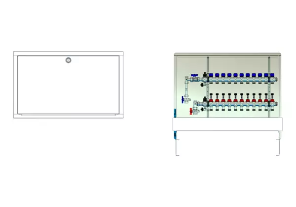 strawa FB-Anschlussstation H 63-WMZ-80 11 Hkr.,BxHxT: 900x725x92 mm, vert. AG. m. WMZ, Verteiler mit DFA 0-3 l/min + THV M30x1,5, Standard-UP-Schrank mit Frontblende in RAL 9016