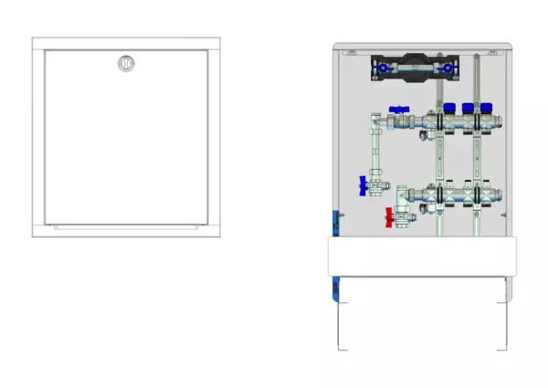 strawa FB-Anschlussstation H 53-W1-WMZ-80 3 Hkr.,BxHxT: 515x725x92 mm, vert. AG m. WMZ, Verteiler mit Regulierventil + THV M30x1,5, Wasserzählerstr. TW kalt, Standard-UP-Schrank mit Frontblende in RAL 9016