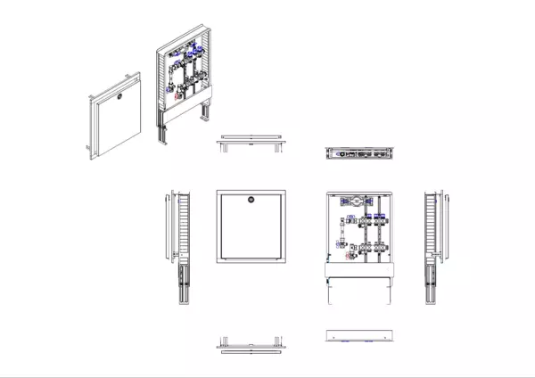 Die Anschlussstation für Flächenheizung und -kühlung ist im Unterputzschrank montiert und umfasst einen Edelstahlverteiler mit integrierten Regulierventilen und Ventileinsätzen (M30x1,5), sowie eine vertikale Anschlussgarnitur mit Wärmezählerverrohrung. Zusätzlich ist eine Wasserzählereinbaustrecke für Trinkwasser kalt vorhanden. Es gibt Platzhaltungen für Stellantriebe.