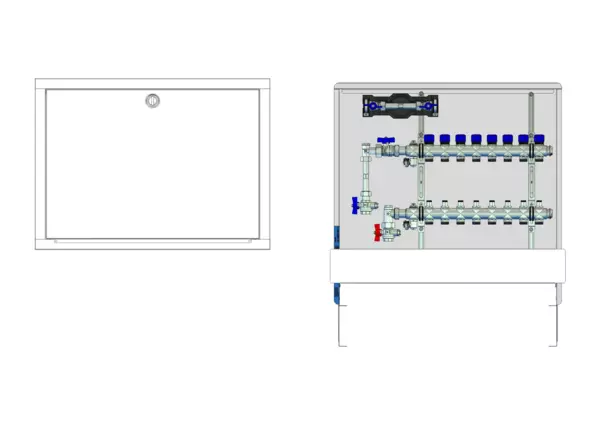 strawa FB-Anschlussstation H 53-W1-WMZ-80 8 Hkr.,BxHxT: 750 x 725 x 92 mm, vert. AG m. WMZ, Verteiler mit Regulierventil + THV M30x1,5, Wasserzählerstr. TW kalt, Standard-UP-Schrank mit Frontblende in RAL 9016