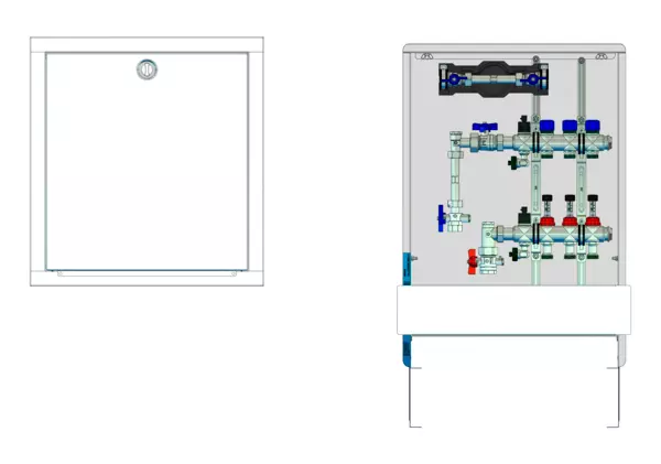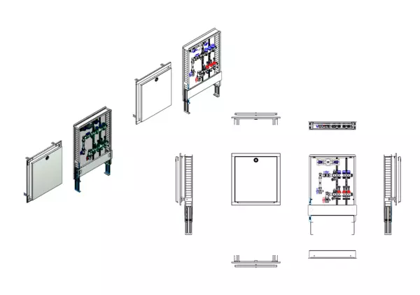 strawa FB-Anschlussstation H 63-W1-WMZ-80 3 Hkr.,BxHxT: 515x725x92 mm, vert. AG. m. WMZ, Verteiler mit DFA 0-3 l/min + THV M30x1,5, Wasserzählerstr. TW kalt, Standard-UP-Schrank mit Frontblende in RAL 9016