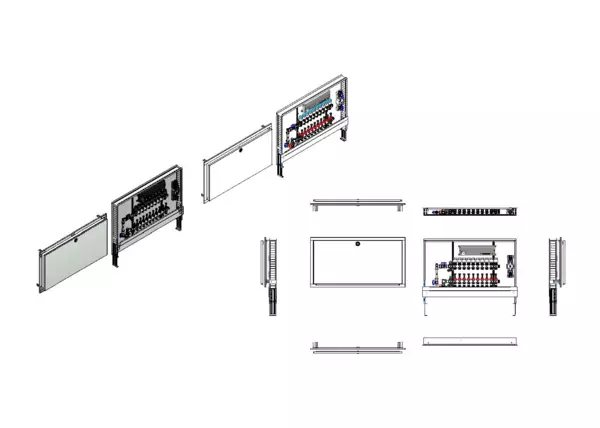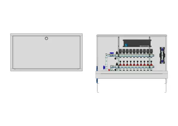 vertikale Anschlussgarnitur mit Wärmezählerverohrung, Verteiler mit Durchflussanzeiger 0-3 l/min im Vorlaufbalken und Thermostatventileinsatz M30x1,5 im Rücklaufbalken, vormontierte Stellantriebe und Klemmleiste mit Vorverdrahtung, Wasserzählerstrecke Trinkwasser kalt, Standard-Unterputz-Schrank mit Frontblende in RAL 9016
