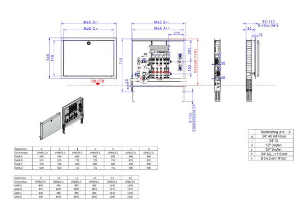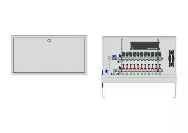 vertikale Anschlussgarnitur mit Wärmezählerverohrung, Verteiler mit Durchflussanzeiger 0-3 l/min im Vorlaufbalken und Thermostatventileinsatz M30x1,5 im Rücklaufbalken, vormontierte Stellantriebe und Klemmleiste mit Vorverdrahtung, Wasserzählerstrecke Trinkwasser kalt, Standard-Unterputz-Schrank mit Frontblende in RAL 9016