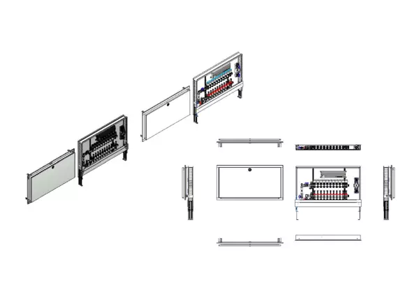Die Anschlussstation für Flächenheizung ist im Unterputzschrank montiert und umfasst einen Edelstahlverteiler mit regulierbaren Durchflussanzeigern und Ventileinsätzen (M30x1,5), sowie eine vertikale Anschlussgarnitur mit Wärmezählerverrohrung. Zusätzlich ist eine Wasserzählereinbaustrecke für Trinkwasser kalt vorhanden. Die vormontierten und verdrahteten Stellantriebe sind auf einer montierten Klemmleiste installiert.