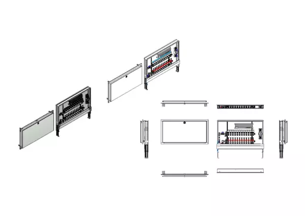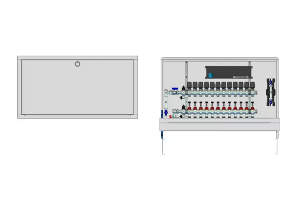 vertikale Anschlussgarnitur mit Wärmezählerverohrung, Verteiler mit Durchflussanzeiger 0-3 l/min im Vorlaufbalken und Thermostatventileinsatz M30x1,5 im Rücklaufbalken, vormontierte Stellantriebe und Klemmleiste mit Vorverdrahtung, Wasserzählerstrecke Trinkwasser kalt, Standard-Unterputz-Schrank mit Frontblende in RAL 9016