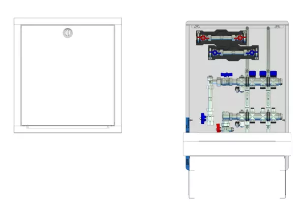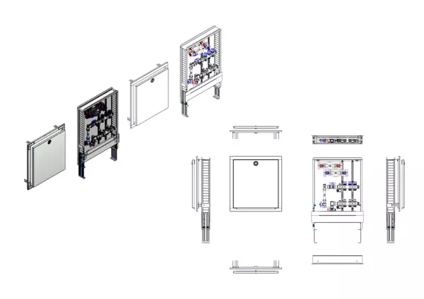 Die Anschlussstation für Flächenheizung und -kühlung ist im Unterputz-Schrank montiert und umfasst einen Edelstahlverteiler mit integrierten Regulierventilen und Ventileinsätzen (M30×1,5) sowie eine vertikale Anschlussgarnitur mit Wärmezählerverrohrung. Zusätzlich sind Wasserzählereinbaustrecken für Trinkwasser kalt und warm vorhanden. Es gibt Platzhaltungen für Stellantriebe.