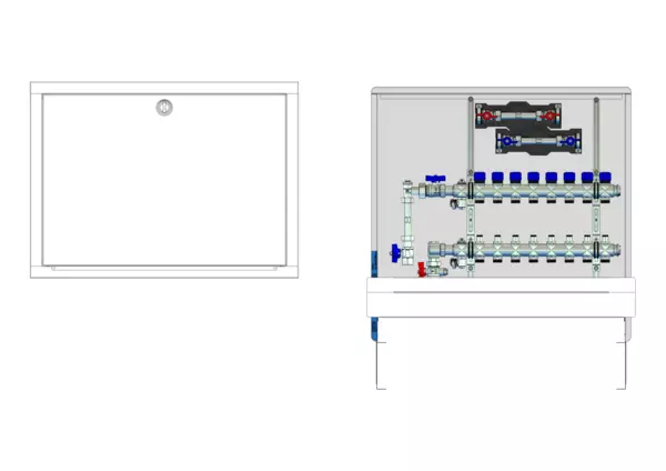 strawa FB-Anschlussstation H 53-W2-WMZ-80 8 Hkr.,BxHxT: 750x725x92 mm, vert. AG m. WMZ, Verteiler mit Regulierventil + THV M30x1,5, Wasserzählerstr. TW kalt und warm, Standard-UP-Schrank mit Frontblende in RAL 9016