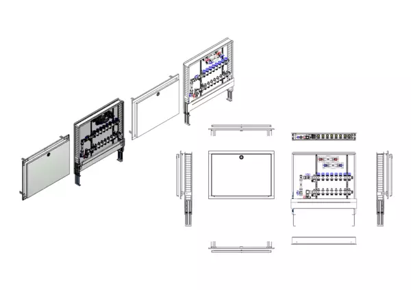Die Anschlussstation für Flächenheizung und -kühlung ist im Unterputz-Schrank montiert und umfasst einen Edelstahlverteiler mit integrierten Regulierventilen und Ventileinsätzen (M30×1,5) sowie eine vertikale Anschlussgarnitur mit Wärmezählerverrohrung. Zusätzlich sind Wasserzählereinbaustrecken für Trinkwasser kalt und warm vorhanden. Es gibt Platzhaltungen für Stellantriebe.