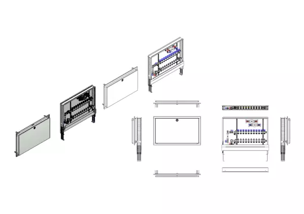 Die Anschlussstation für Flächenheizung und -kühlung ist im Unterputz-Schrank montiert und umfasst einen Edelstahlverteiler mit integrierten Regulierventilen und Ventileinsätzen (M30×1,5) sowie eine vertikale Anschlussgarnitur mit Wärmezählerverrohrung. Zusätzlich sind Wasserzählereinbaustrecken für Trinkwasser kalt und warm vorhanden. Es gibt Platzhaltungen für Stellantriebe.