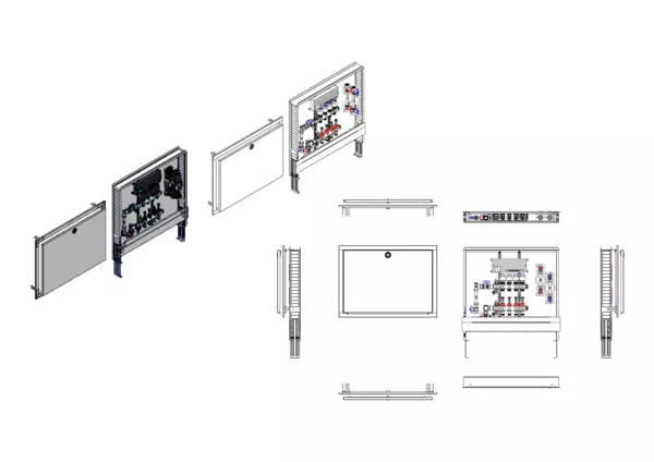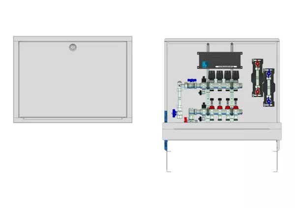 vertikale Anschlussgarnitur mit Wärmezählerverohrung, Verteiler mit Durchflussanzeiger 0-3 l/min im Vorlaufbalken und Thermostatventileinsatz M30x1,5 im Rücklaufbalken, vormontierte Stellantriebe und Klemmleiste mit Vorverdrahtung, Wasserzählerstrecken Trinkwasser kalt und warm, Standard-Unterputz-Schrank mit Frontblende RAL 9016