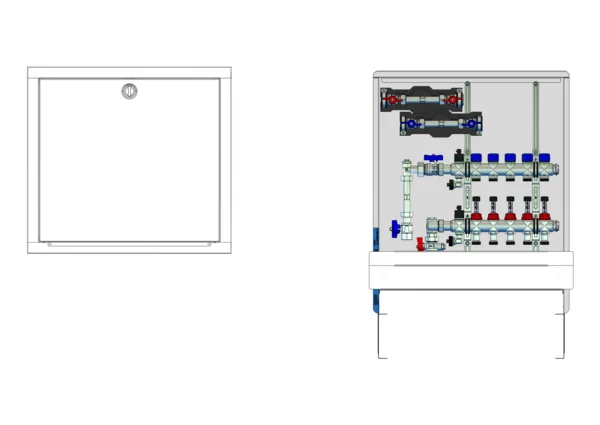 strawa FB-Anschlussstation H 63-W2-WMZ-80 5 Hkr.,BxHxT: 600x725x92 mm, vert. AG. m. WMZ, Verteiler mit DFA 0-3 l/min + THV M30x1,5, Wasserzählerstr. TW kalt und warm, Standard-UP-Schrank mit Frontblende in RAL 9016