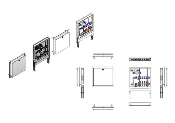Die Anschlussstation für Flächenheizung und -kühlung ist im Unterputzschrank montiert und umfasst einen Edelstahlverteiler mit regulierbaren Durchflussanzeigern und Ventileinsätzen (M30x1,5), sowie eine vertikale Anschlussgarnitur mit Wärmezählerverrohrung. Zusätzlich sind Wasserzählereinbaustrecken für Trinkwasser kalt und warm vorhanden. Es gibt Platzhaltungen für Stellantriebe.