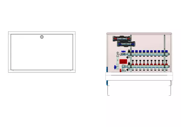 strawa FB-Anschlussstation H 63-W2-WMZ-80 10 Hkr.,BxHxT: 900 x 725 x 92 mm, vert. AG. m. WMZ, Verteiler mit DFA 0-3 l/min + THV M30x1,5, Wasserzählerstr. TW kalt und warm, Standard-UP-Schrank mit Frontblende in RAL 9016