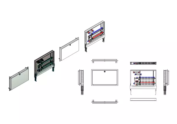 Die Anschlussstation für Flächenheizung und -kühlung ist im Unterputzschrank montiert und umfasst einen Edelstahlverteiler mit regulierbaren Durchflussanzeigern und Ventileinsätzen (M30x1,5), sowie eine vertikale Anschlussgarnitur mit Wärmezählerverrohrung. Zusätzlich sind Wasserzählereinbaustrecken für Trinkwasser kalt und warm vorhanden. Es gibt Platzhaltungen für Stellantriebe.