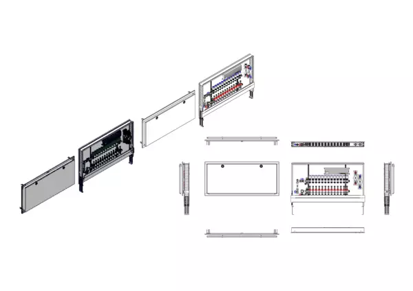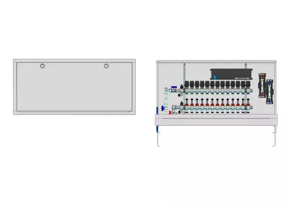 vertikale Anschlussgarnitur mit Wärmezählerverohrung, Verteiler mit Durchflussanzeiger 0-3 l/min im Vorlaufbalken und Thermostatventileinsatz M30x1,5 im Rücklaufbalken, vormontierte Stellantriebe und Klemmleiste mit Vorverdrahtung, Wasserzählerstrecken Trinkwasser kalt und warm, Standard-Unterputz-Schrank mit Frontblende RAL 9016