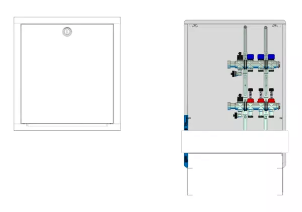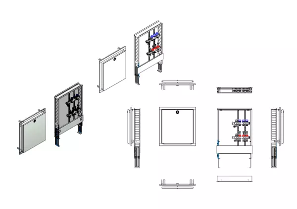 Die modulare Anschlussstation für Flächenheizung und -kühlung ist im Unterputzschrank montiert und umfasst einen Edelstahlverteiler mit regulierbaren Durchflussanzeigern und Ventileinsätzen (M30x1,5), sowie eine horizontale Anschlussgarnitur ohne Wärmezählerverrohrung. Es gibt Platzhaltungen für Anschlussgarnituren mit oder ohne Wärmezählerverrohrung, eine Klemmleiste und Stellantriebe.