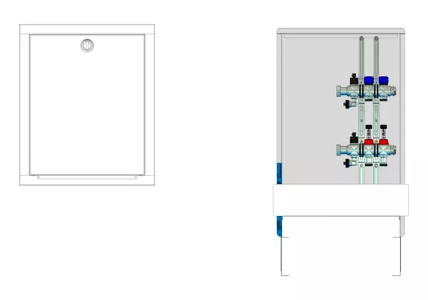 strawa FB-Anschlussstation HX 63 2 Hkr.,BxHxT: 460 x 725 x 92 mm, ohne Anschlussgarnitur, Verteiler mit DFA 0-3 l/min + THV M30x1,5, Standard-UP-Schrank mit Frontblende in RAL 9016