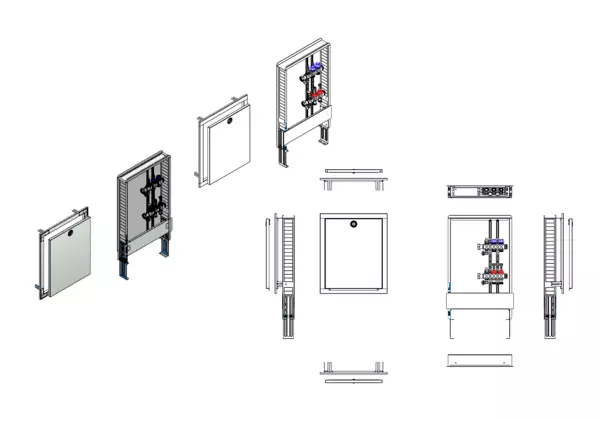 Die modulare Anschlussstation für Flächenheizung und -kühlung ist im Unterputzschrank montiert und umfasst einen Edelstahlverteiler mit regulierbaren Durchflussanzeigern und Ventileinsätzen (M30x1,5), sowie eine horizontale Anschlussgarnitur ohne Wärmezählerverrohrung. Es gibt Platzhaltungen für Anschlussgarnituren mit oder ohne Wärmezählerverrohrung, eine Klemmleiste und Stellantriebe.