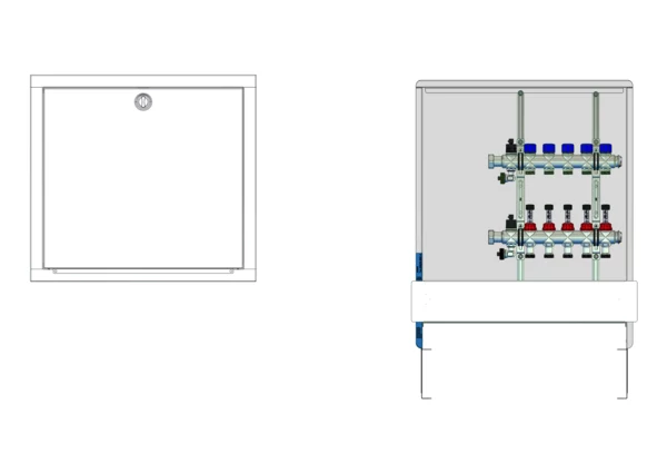 ohne Anschlussgarnitur, Verteiler mit Durchflussanzeiger 0-3 l/min im Vorlaufbalken und Thermostatventileinsatz M30x1,5 im Rücklaufbalken, Standard-Unterputz-Schrank mit Frontblende in RAL 9016