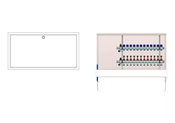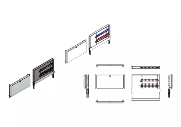 Die modulare Anschlussstation für Flächenheizung und -kühlung ist im Unterputzschrank montiert und umfasst einen Edelstahlverteiler mit regulierbaren Durchflussanzeigern und Ventileinsätzen (M30x1,5), sowie eine horizontale Anschlussgarnitur ohne Wärmezählerverrohrung. Es gibt Platzhaltungen für Anschlussgarnituren mit oder ohne Wärmezählerverrohrung, eine Klemmleiste und Stellantriebe.
