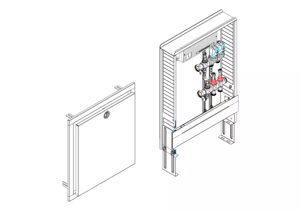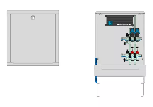 strawa FB-Anschlussstation HX 18-EGO 2 Hkr.,BxHxT: 515x725x122 mm, ohne Anschlussgarnitur, Verteiler mit DFA min/max + THV, mit vorm. EGO-Regelantrieben u. Klemmleiste mit Vorverdraht., Standard-UP-Schrank mit Frontbl. in RAL 9016