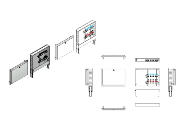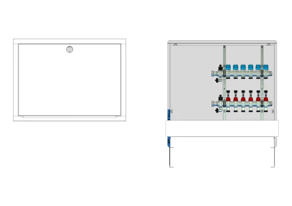 Der Unterputzschrank enthält einen Edelstahlverteiler mit absperrbaren Durchflussanzeigern und Ventileinsätzen, ausgestattet mit dem EGO-Schnellverschluss. Der Schrank bietet Platz für Anschlussgarnituren mit oder ohne Wärmezählerverrohrung, Klemmleisten und EGO-Regelantriebe.