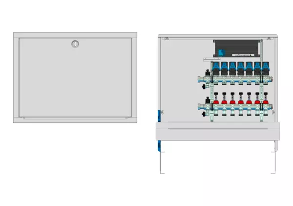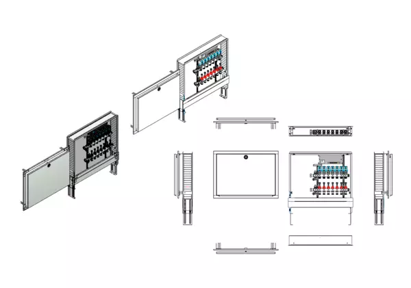Die modulare Anschlussstation für Flächenheizung bietet einen vollautomatischen hydraulischen Abgleich der Heizkreise dank des integrierten EGO-Systems. Im Unterputzschrank befindet sich ein Edelstahlverteiler mit absperrbaren Durchflussanzeigern und Ventileinsätzen. Jeder Heizkreis ist mit vormontierten, verdrahteten intelligenten autonomen elektrothermischen EGO-Regelantrieben ausgestattet, die auf einer Klemmleiste elektrisch vorverdrahtet sind. Die Station bietet Platz für Anschlussgarnituren mit oder ohne Wärmezählerverrohrung.