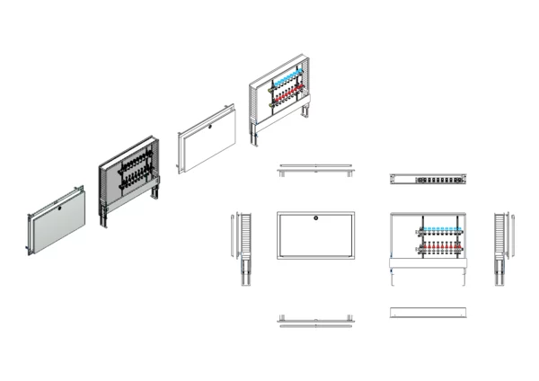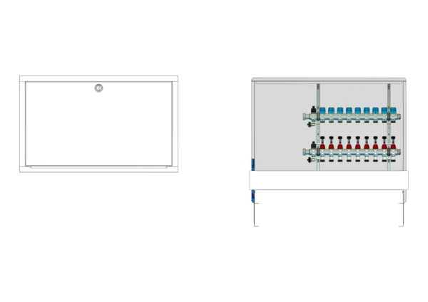Der Unterputzschrank enthält einen Edelstahlverteiler mit absperrbaren Durchflussanzeigern und Ventileinsätzen, ausgestattet mit dem EGO-Schnellverschluss. Der Schrank bietet Platz für Anschlussgarnituren mit oder ohne Wärmezählerverrohrung, Klemmleisten und EGO-Regelantriebe.