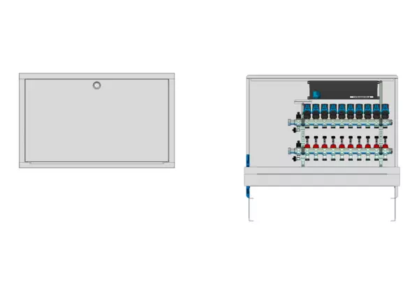 ohne Anschlussgarnitur, Verteiler mit Durchflussanzeiger min/max im Vorlaufbalken und Thermostatventileinsatz für EGO-Aufnahme im Rücklaufbalken, mit vormontierten EGO-Regelantrieben und Klemmleiste mit Vorverdrahtung, Standard-Unterputz-Schrank mit Frontblende in RAL 9016