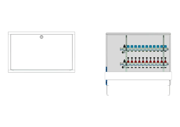 ohne Anschlussgarnitur, Verteiler mit Durchflussanzeiger min/max im Vorlaufbalken und Thermostatventileinsatz für EGO-Aufnahme im Rücklaufbalken, Standard-Unterputz-Schrank mit Frontblende in RAL 9016