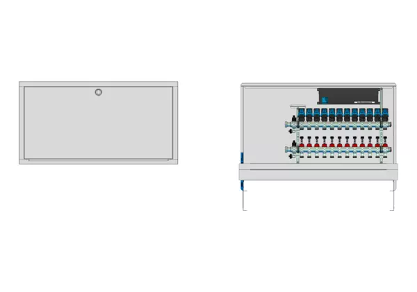 strawa FB-Anschlussstation HX 18-EGO 12 Hkr.,BxHxT: 1050x725x122 mm, ohne Anschlussgarnitur, Verteiler mit DFA min/max + THV, mit vorm. EGO-Regelantrieben u. Klemmleiste mit Vorverdraht., Standard-UP-Schrank mit Frontbl. in RAL 9016
