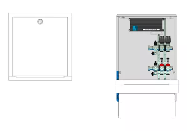 strawa FB-Anschlussstation HX 63-X 2 Hkr.,BxHxT: 515 x 725 x 122 mm, ohne Anschlussgarnitur, Verteiler mit DFA 0-3 l/min + THV M30x1,5, mit vorm. Stellantrieben und Klemmleiste mit Vorverdrahtung, Standard-UP-Schrank mit Frontblende in RAL 9016