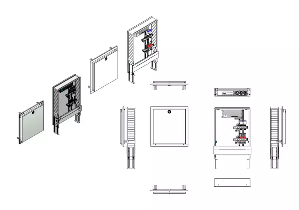 Die modulare Anschlussstation für Flächenheizung ist im Unterputzschrank montiert und umfasst einen Edelstahlverteiler mit regulierbaren Durchflussanzeigern und Ventileinsätzen (M30x1,5), sowie eine horizontale Anschlussgarnitur ohne Wärmezählerverrohrung. Die vormontierten und verdrahteten Stellantriebe sind auf einer montierten Klemmleiste installiert. Es gibt Platzhaltungen für Anschlussgarnituren mit oder ohne Wärmezählerverrohrung.