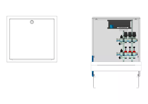 strawa FB-Anschlussstation HX 63-X 3 Hkr.,BxHxT: 600 x 725 x 122 mm, ohne Anschlussgarnitur, Verteiler mit DFA 0-3 l/min + THV M30x1,5, mit vorm. Stellantrieben und Klemmleiste mit Vorverdrahtung, Standard-UP-Schrank mit Frontblende in RAL 9016