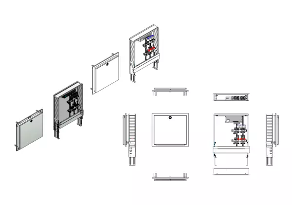 Die modulare Anschlussstation für Flächenheizung ist im Unterputzschrank montiert und umfasst einen Edelstahlverteiler mit regulierbaren Durchflussanzeigern und Ventileinsätzen (M30x1,5), sowie eine horizontale Anschlussgarnitur ohne Wärmezählerverrohrung. Die vormontierten und verdrahteten Stellantriebe sind auf einer montierten Klemmleiste installiert. Es gibt Platzhaltungen für Anschlussgarnituren mit oder ohne Wärmezählerverrohrung.