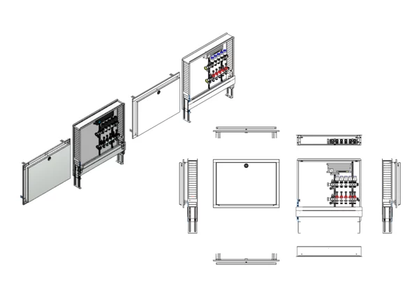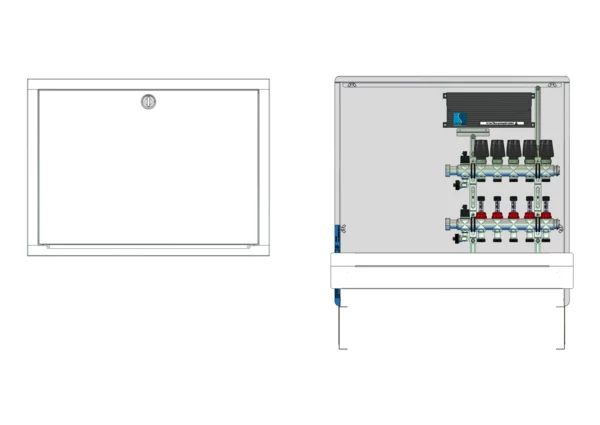 Die modulare Anschlussstation für Flächenheizung ist im Unterputzschrank montiert und umfasst einen Edelstahlverteiler mit regulierbaren Durchflussanzeigern und Ventileinsätzen (M30x1,5), sowie eine horizontale Anschlussgarnitur ohne Wärmezählerverrohrung. Die vormontierten und verdrahteten Stellantriebe sind auf einer montierten Klemmleiste installiert. Es gibt Platzhaltungen für Anschlussgarnituren mit oder ohne Wärmezählerverrohrung.