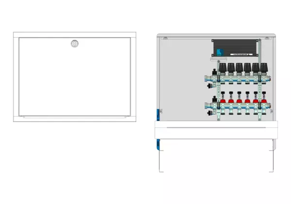 strawa FB-Anschlussstation HX 63-X 6 Hkr.,BxHxT: 750 x 725 x 122 mm, ohne Anschlussgarnitur, Verteiler mit DFA 0-3 l/min + THV M30x1,5, mit vorm. Stellantrieben und Klemmleiste mit Vorverdrahtung, Standard-UP-Schrank mit Frontblende in RAL 9016