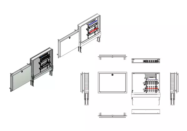 Die modulare Anschlussstation für Flächenheizung ist im Unterputzschrank montiert und umfasst einen Edelstahlverteiler mit regulierbaren Durchflussanzeigern und Ventileinsätzen (M30x1,5), sowie eine horizontale Anschlussgarnitur ohne Wärmezählerverrohrung. Die vormontierten und verdrahteten Stellantriebe sind auf einer montierten Klemmleiste installiert. Es gibt Platzhaltungen für Anschlussgarnituren mit oder ohne Wärmezählerverrohrung.