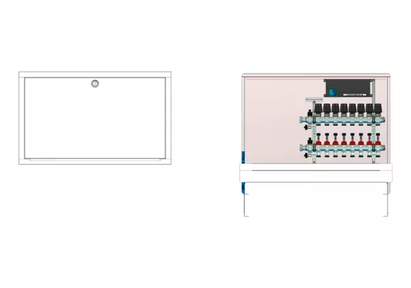 Die modulare Anschlussstation für Flächenheizung ist im Unterputzschrank montiert und umfasst einen Edelstahlverteiler mit regulierbaren Durchflussanzeigern und Ventileinsätzen (M30x1,5), sowie eine horizontale Anschlussgarnitur ohne Wärmezählerverrohrung. Die vormontierten und verdrahteten Stellantriebe sind auf einer montierten Klemmleiste installiert. Es gibt Platzhaltungen für Anschlussgarnituren mit oder ohne Wärmezählerverrohrung.
