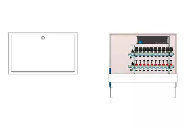 strawa FB-Anschlussstation HX 63-X 10 Hkr.,BxHxT: 900 x 725 x 122 mm, ohne Anschlussgarnitur, Verteiler mit DFA 0-3 l/min + THV M30x1,5, mit vorm. Stellantrieben und Klemmleiste mit Vorverdrahtung, Standard-UP-Schrank mit Frontblende in RAL 9016